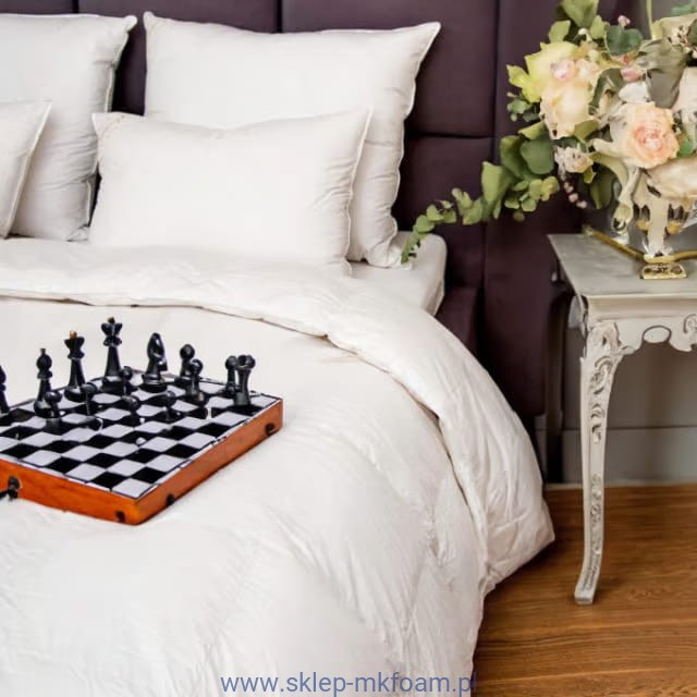 Wypełnienie kołdry z 100% gęsiego puchu klasy eksportowej otacza delikatnością, a poszewka z mako-bawełny dodaje kołdrze luksusowego charakteru. Idealna do sypialni, w której panuje temperatura 20-22°C.