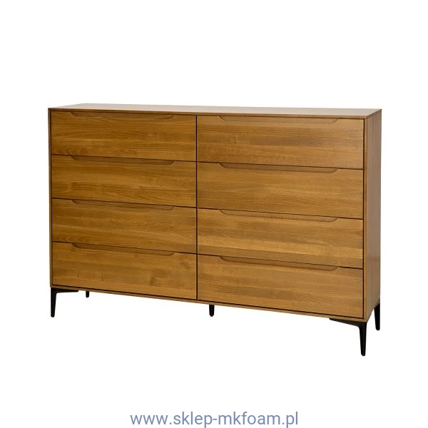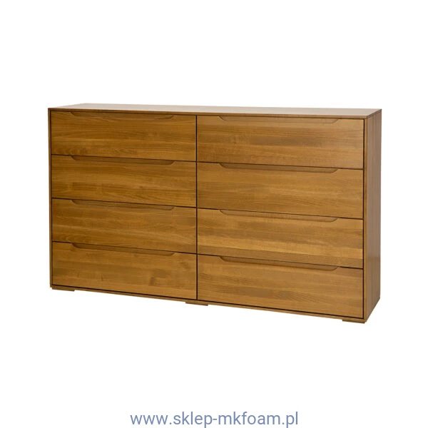 Bukowa komoda DKD420 z kolekcji Modern, została stworzona z myślą o miłośnikach nowoczesnego minimalizmu. Mimo prostej formy zachwyca i przyciąga wzrok już od progu. Solidne, pozbawione zbędnych zdobień fronty dopełniają subtelne, wycięte w drewnie uchwyty, tworzące system otwierania i zamykania. Wyposażona w pojemne i funkcjonalne szuflady idealnie sprawdzi się do przechowywania licznych domowych bibelotów. Jej atutem jest też duży, bukowy blat, na którym pięknie prezentować się będą rodzinne pamiątki lub fotografie. Komoda osadzona została na niewielkich drewnianych nóżkach. Istnieje jednak możliwość dokupienia nóżek aluminiowych o wysokości 10 cm NG 002, jak również nóżek metalowych o wysokości 15 cm NG003. Dzięki takiemu zabiegowi można w prosty sposób zmienić całkowicie charakter i styl mebla.