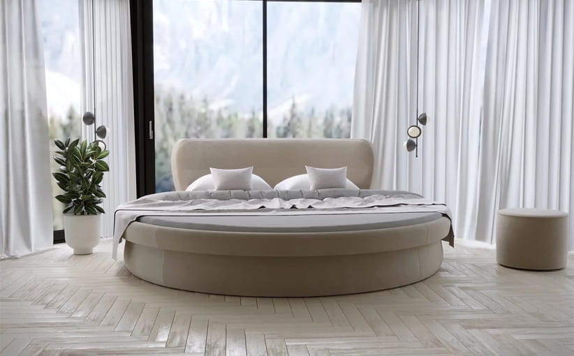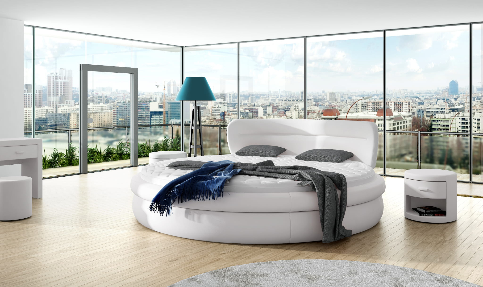 Okrągłe łóżko jest to propozycja do większych sypialni, które można wzbogacić dodatkowymi tapicerowanymi meblami jak szafka czy pufa.
