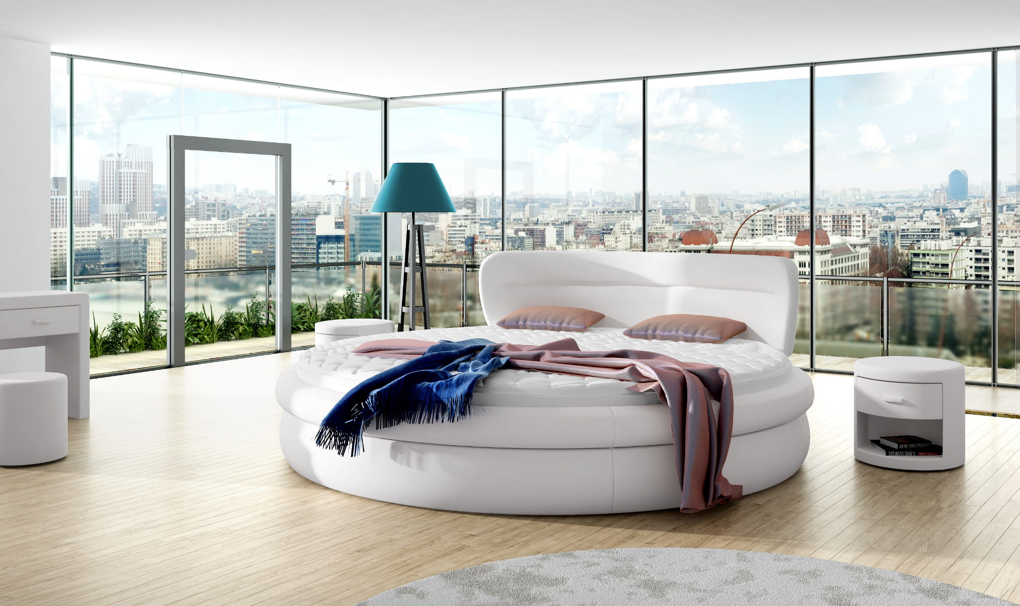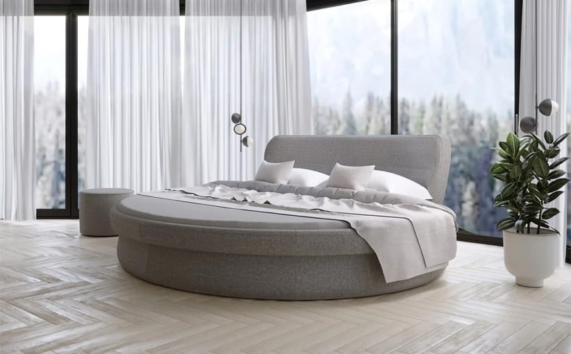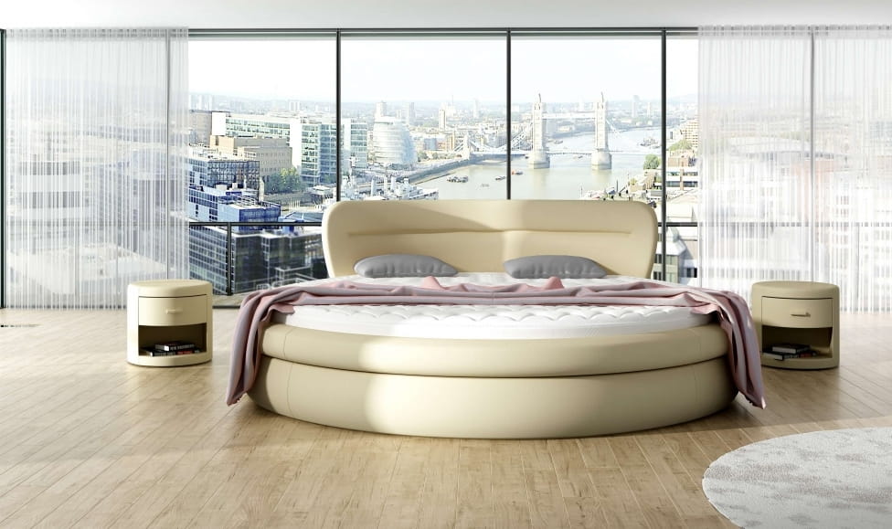 Okrągłe łóżko jest to propozycja do większych sypialni, które można wzbogacić dodatkowymi tapicerowanymi meblami jak szafka czy pufa.