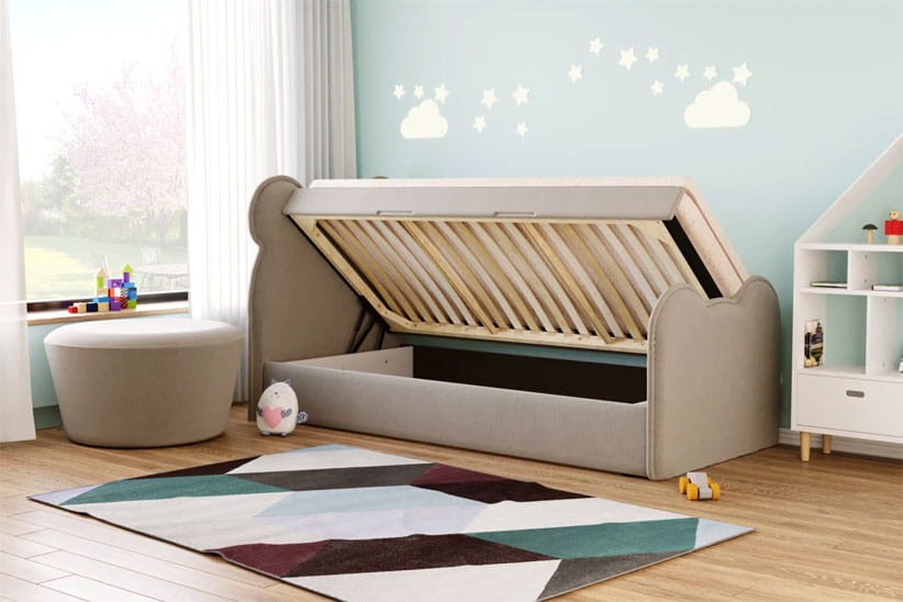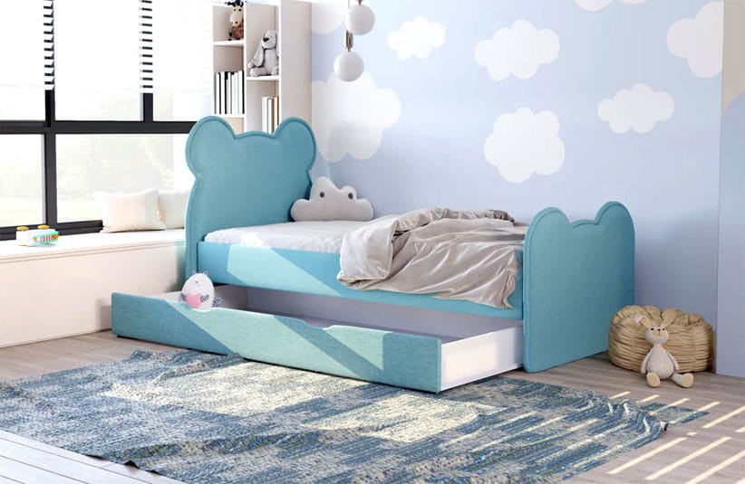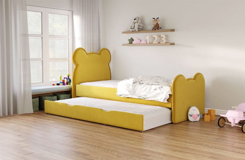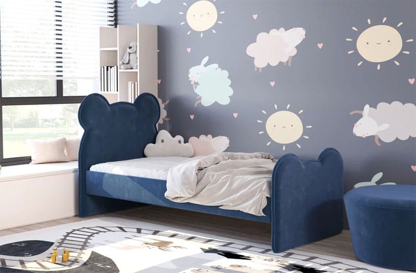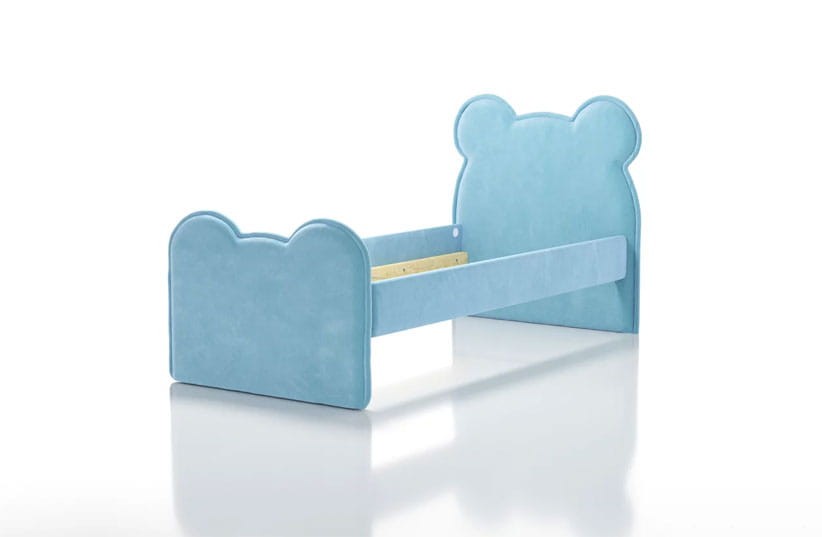 Dziecięce łóżko tapicerowane zbudowane na prostym i solidnym korpusie oraz uroczego zagłówka i zanóżka w kształcie misia.