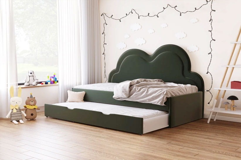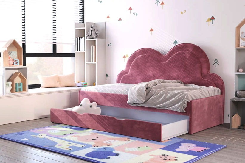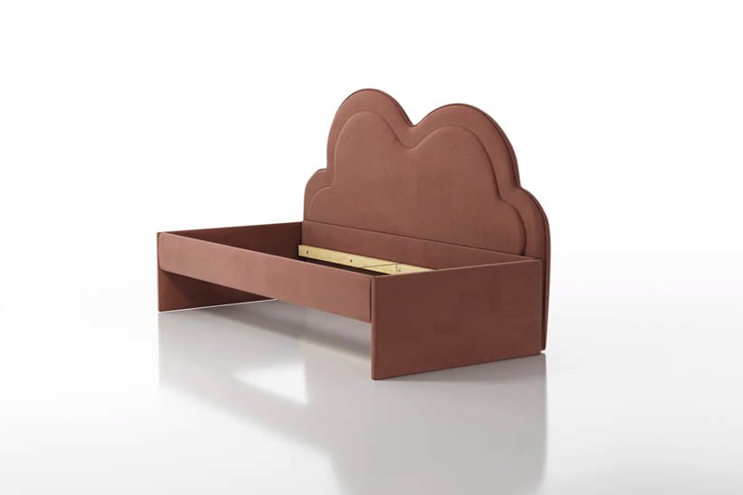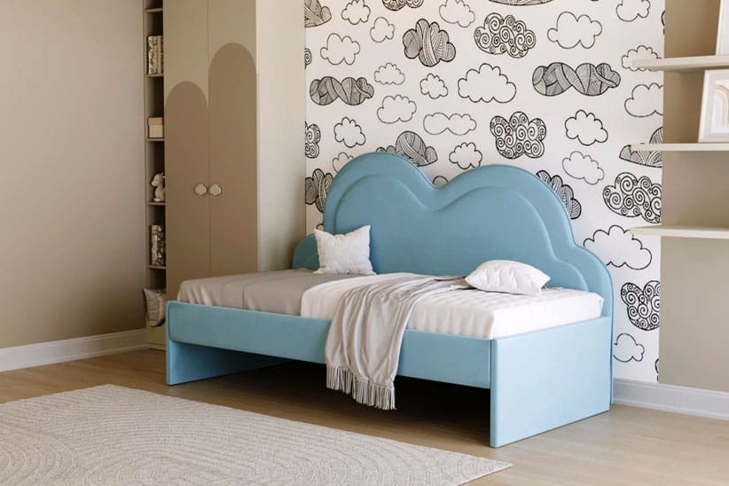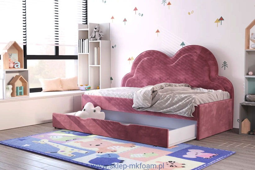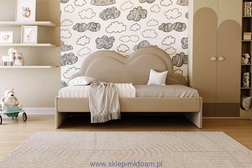 Dziecięce łóżko tapicerowane zbudowane na prostym i solidnym korpusie oraz uroczego zagłówka i zanóżka w kształcie chmurki.