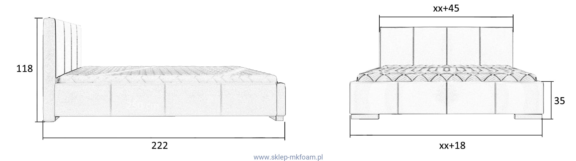 • Szerokość zagłówka +45 cm do szer. materaca;