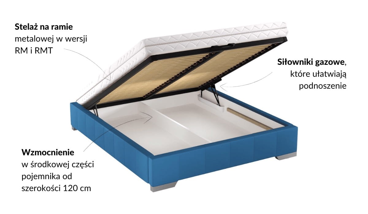 • RM- łóżko wyposażone w stelaż na ramie metalowej, z listwami giętkimi oraz pojemnikiem na pościel