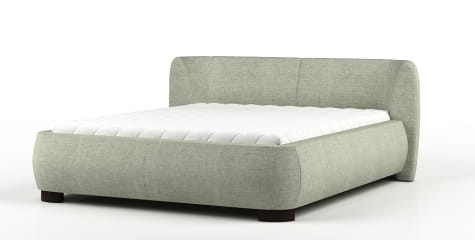 Łóżko ze stelażem na Ramie Drewnianej. Obła podstawa została wzbogacona okazałym i bardzo wyrazistym zaokrąglonym zagłówkiem, które nadaje całości ciekawego, nowoczesnego charakteru. Krawędzie i rogi korpusu są zaokrąglone jak zagłówek, który jest również zaoblony, sprawia wrażenie zamykać całość i otulać do snu. Dzięki temu łóżko sprawi się zarówno w pomieszczeniach nowoczesnych jak i bardziej klasycznych zależnie od wybranej tkaniny i dodatków.