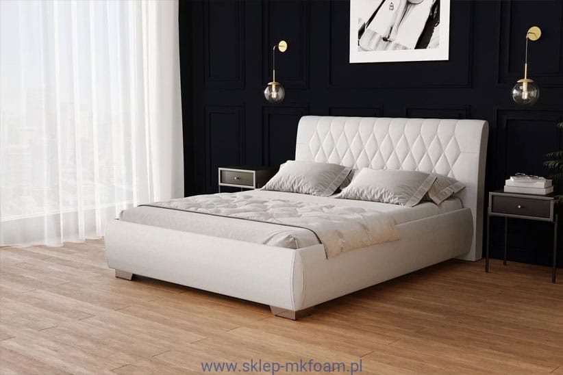 Zagłówek łóżka w tylnej części jest otapicerowany. Łóżko dostępne w wersji z zagłówkiem z kryształkami.
