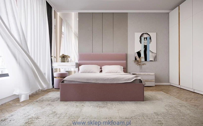 Prosta konstrukcja ramy w połączeniu z zagłówkiem który jest bardzo wygodny i posiada grube poziome miękkie wałki tworzy klasyczną bryłę wpasowującą się w każde wnętrze. Tak naprawdę  łózko to może dokonać ogromnej metamorfozy poprzez dobór odpowiedniej tkaniny.