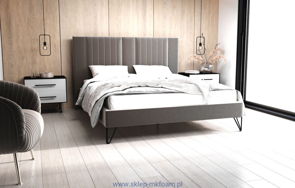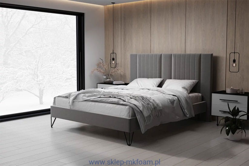 Jest to nowoczesne łóżko, które z łatwością znajdzie miejsce w każdej sypialni. Stonowane, pionowe pikowanie zamknięte w w ramie tapicerowanej jest bardzo estetyczne. Solidna konstrukcja ramy rama łóżka została wsparta na wysokich, metalowych nóżkach.