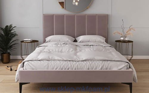 Łóżko tapicerowane 81244 Łóżko M&K Foam Koło ma solidny, duży zagłówek oraz ciekawie kontrastujące z nim, bardziej subtelne nóżki do wyboru w trzech wzorach.