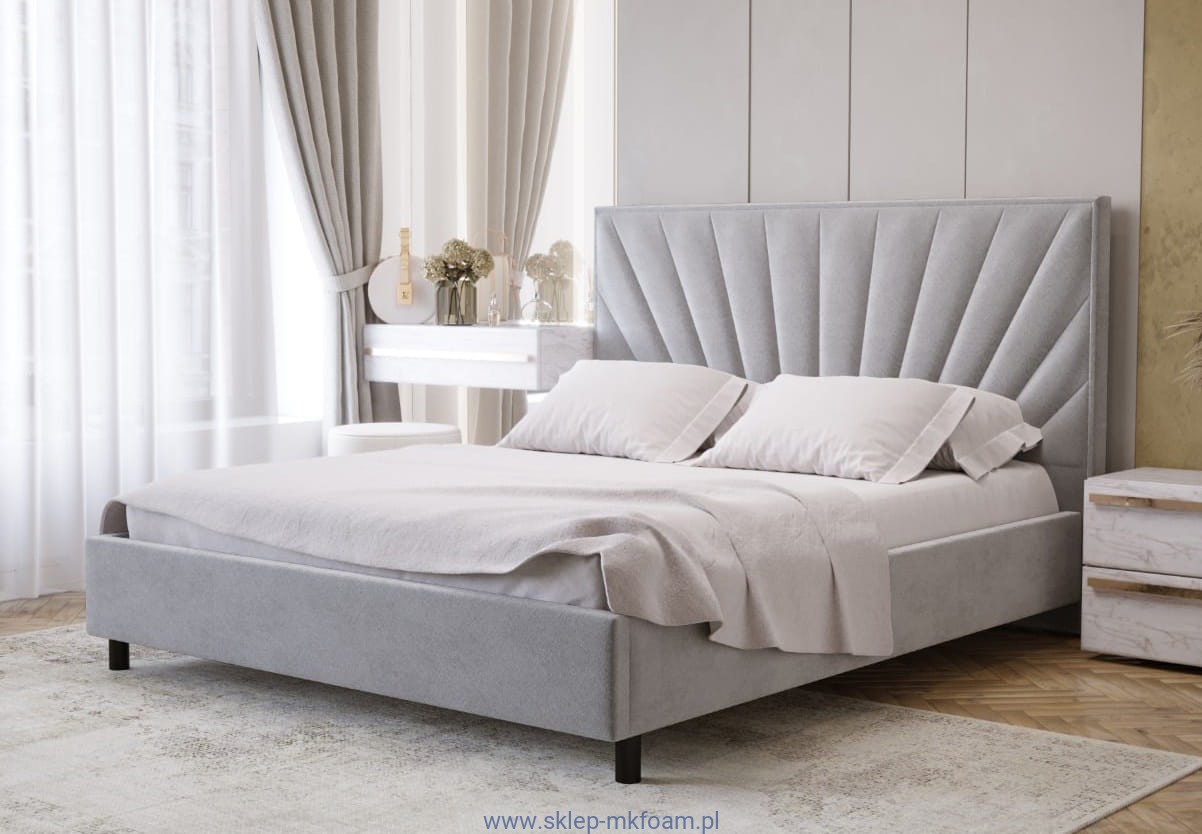 To nowoczesne łóżko, które z łatwością znajdzie miejsce w każdej sypialni. Pikowanie niczym słońce zamknięte w w ramie zagłówka jest bardzo estetyczne. Solidna konstrukcja ramy rama łóżka została wsparta na wysokich, metalowych nóżkach.