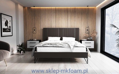 Łóżko tapicerowane 81241 Łóżko M&K Foam Koło ma solidny, duży zagłówek oraz ciekawie kontrastujące z nim, bardziej subtelne nóżki do wyboru w trzech wzorach.