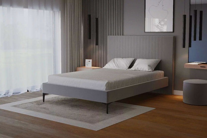 Rama łóżka posiada prostą formę, jednak tym, co najbardziej zwraca uwagę, jest jednak zagłówek. Tylna ściana łóżka rzuca się w oczy dzięki geometrycznej konstrukcji, której obicie wydaje się złożone z kilku pionowych fragmentów. Prostopadłe kształty pozwalają nieco urozmaicić dość masywny zagłówek o dużej wysokości i sporej grubości.