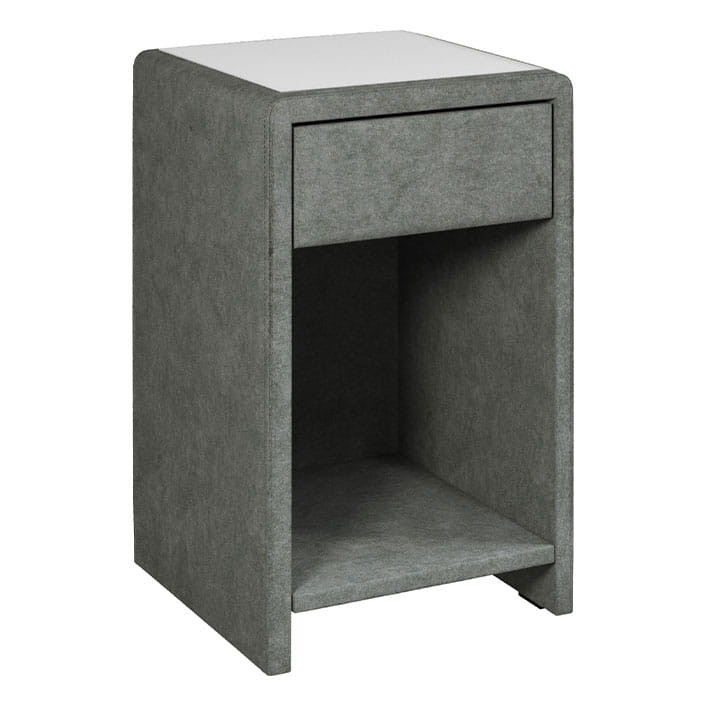 Wyższa szafka nocna z wieloma powierzchniami do przechowywania. Elegancka i smukła, a równocześnie bardzo praktyczna i przemyślana. Ma niewielki blat, dwie szuflady z wygodnymi dużymi uchwytami, całkiem sporą wnękę z półką oraz niewielką przestrzeń pod półką, gdzie można np. schować kapcie przed spaniem, aby po przebudzeniu były w zasięgu ręki. Mebel jest dostępny w wielu tkaninach obicia oraz najmodniejszych kolorach, co daje duże możliwości aranżacyjne. Ciekawy i praktyczny wybór.
