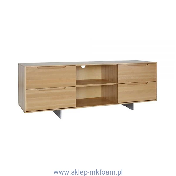Szafka oferuje cztery pojemne szuflady bez uchwytów – idealne na dokumenty, akcesoria czy inne domowe drobiazgi. Dwie otwarte półki pozwalają wygodnie ustawić sprzęt RTV, a specjalne otwory na kable zapewniają łatwe podłączenie i odpowiednią cyrkulację powietrza.