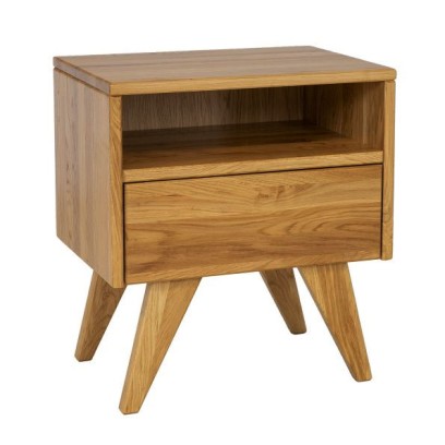 Stylowa szafka nocna SN301, wykonana z litego drewna dębowego. Funkcjonalny korpus szafki tworzy jedna otwarta półka oraz jedna bezuchwytowa szuflada, która świetnie sprawdzi się do przechowywania podręcznych kosmetyków, czy książek. Minimalistyczny design oraz niepowtarzalne, skośne nogi sprawiają, że szafka nocna SN301 idealnie wpisuje się w modny, nowoczesny styl. Niewielki, ale piękny blat mebla to idealne miejsce na rodzinne zdjęcie lub ozdobną lampkę nocną. Ciepło naturalnego drewna dębowego, z którego powstała stworzy piękny, przytulny klimat w sypialni.