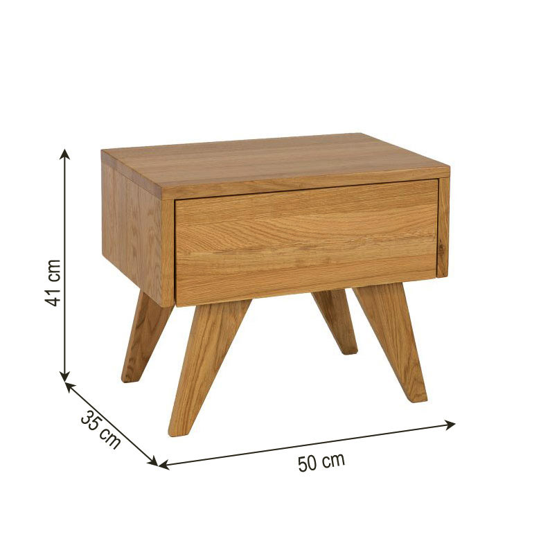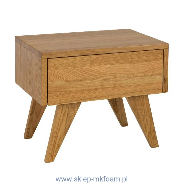Stylowa szafka nocna dS302, wykonana z litego drewna dębowego. Funkcjonalny korpus szafki tworzy jedna otwarta półka oraz jedna bezuchwytowa szuflada, która świetnie sprawdzi się do przechowywania podręcznych kosmetyków, czy książek. Minimalistyczny design oraz niepowtarzalne, skośne nogi sprawiają, że szafka nocna SN301 idealnie wpisuje się w modny, nowoczesny styl. Niewielki, ale piękny blat mebla to idealne miejsce na rodzinne zdjęcie lub ozdobną lampkę nocną. Ciepło naturalnego drewna dębowego, z którego powstała stworzy piękny, przytulny klimat w sypialni.